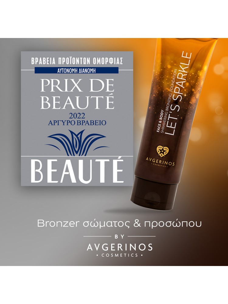 Ένα μοναδικό bronzer σώματος και προσώπου που προσφέρει ηλιοκαμένη και λαμπερή όψη χωρίς τα επιβλαβή αποτελέσματα του ήλιου. Καμουφλάρει μικροατέλειες, μειώνει οπτικά την κυτταρίτιδα και κάνει τη σιλουέτα να δείχνει πιο τονωμένη, πιο λεπτή. Εφαρμόζεται εύκολα και ομοιόμορφα, και χάρη στην 24ωρη φόρμουλα ταχείας αφομοίωσης στεγνώνει γρήγορα και παραμένει αναλλοίωτη, όλο το 24ωρο, ενώ ξεπλένεται πανεύκολα. Τέλος, η water-resistant φόρμουλά της είναι εμπλουτισμένη με βιταμίνη Ε για να προσφέρει πολύτιμη αντιοξειδωτική προστασία στην επιδερμίδα. Αφήνει το αγαπημένο σας απαλό άρωμα BABY TALC που θυμίζει παιδική πούδρα και ξυπνά συναισθήματα γλυκύτητας με σέξι νότες. Κυκλοφορεί σε ένα εξαιρετικό χρώμα που θα αγαπήσετε, το οποίο ταιριάζει σε κάθε χρωματικό τόνο επιδερμίδας γιατί μπορεί να αλλάξει στην ένταση που επιθυμείτε. Μπορείτε να ελέγξετε εσείς την κάλυψη, το χρώμα και το ιριδίζον αποτέλεσμα ανάλογα με το γούστο σας !! Το Let’s Sparkle είναι δερματολογικά ελεγμένο, δεν περιέχει parabens, mineral oil, SLES, προπυλενογλυκόλη και συστατικά ζωικής προέλευσης.