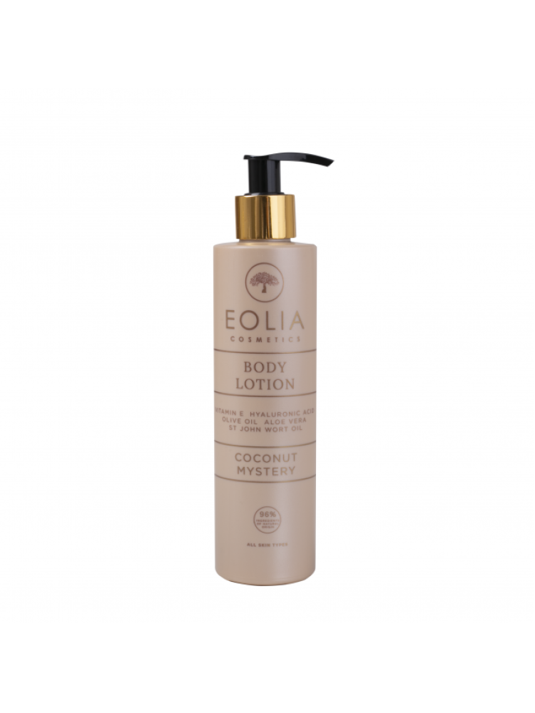 Γαλάκτωμα σώματος με Υαλουρονικό οξύ, Ελαιόλαδο ψυχρής έκθλιψης, Βαλσαμέλαιο, Αλόη και βιταμίνη Ε. Η πλούσια σύνθεση του αποτρέπει την απώλεια υγρασίας ενώ παράλληλα ενυδατώνει. Με το τροπικό και μυστηριώδες άρωμα καρύδας που σαγηνεύει σαν Ελληνικό ηλιόλουστο καλοκαίρι